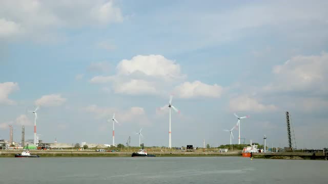 Tugboats and barges near port with wind turbines in background / Antwerp, Belgium