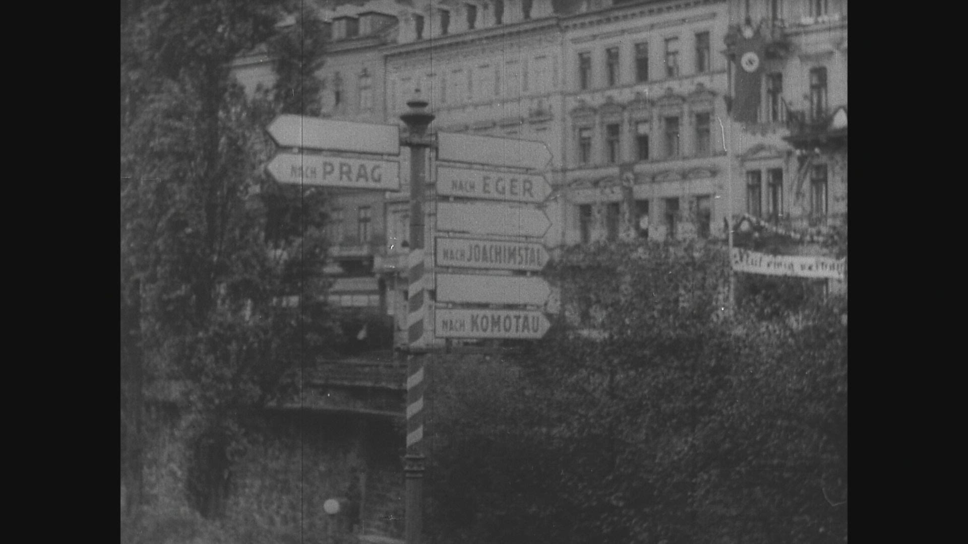 Adolf Hitler moves into Sudetenland following Munich Pact. British Prime Minister Neville Chamberlain CU. Headlines in Czech. Hitler Hermann Göring, Benito Mussolini, Chamberlain, French Premier Édouard Daladier meet at Munich. Chamberlain, Daladier, Mussolini sign pact; Mussolini, Hitler together CU; Chamberlain arrives at airport in London, waves copy of agreement in infamous shot; he says pact means desire of all parties for peace; PM in motorcade to 10 Downing Street as crowds wave and cheer. PM on balcony of Buckingham Palace with King and Queen; crowds wave handkerchiefs. German troops cross border into Sudetenland. Show of welcome by Czechs for Hitler on parade standing in open car; Hitler CU; trucks, motorcycles with German troops.