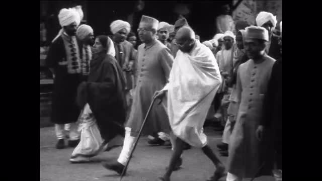 Gandhi walks in 'diaper'; leads crowds; assistant Madeline Slade CU; Gandhi with followers; demonstrations against British; British colonial police beat Indians in street with clubs; injured taken away by ambulance; G returns from UK; shots of prison where he was held; walks with Viceroy of India Lord Mountbatten and Lady M. to negotiate independence; G speaks; Nehru CU; CU UN flag; Nehru, Mountbatten sign agreement granting independence; Gandhi speaks to calm civil strife; his funeral: urn with ashes on parade; crowds; funeral barge on Ganges River; weeping people