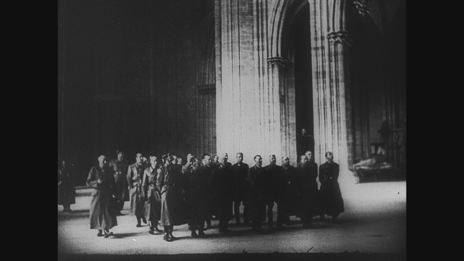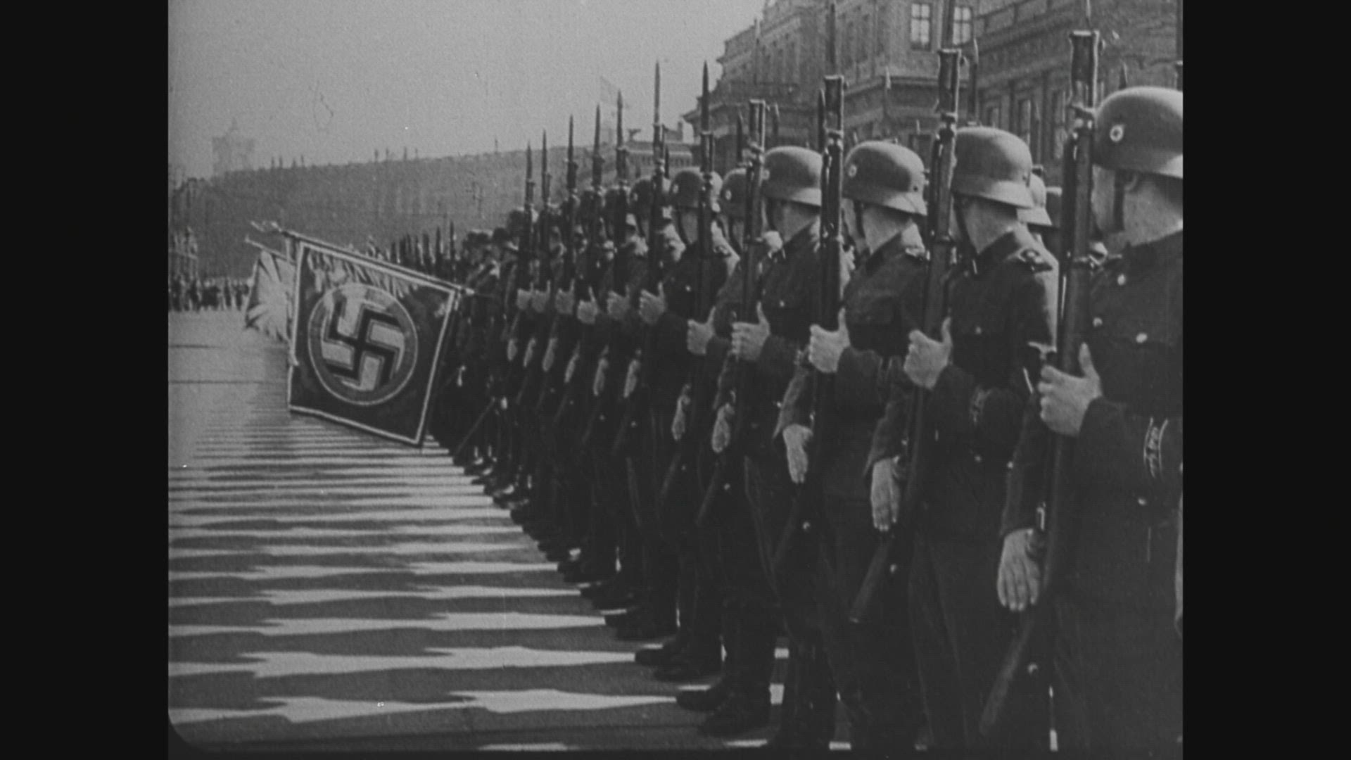 Germans conquer Liege, Namur, Sedan, Montmedy, Metz, Verdun; Hitler greeted by crowd of soldiers, all heil;railroad guns, huge explosions; infantry attacks; shell-marked pillboxes, French soldiers surrender; Nazi officer at map;artillery (repeat); infantry (repeat);bicycle troops;motorized infantry (repeat); cavalry; attack on burning building; soldiers surrender to Nazis; horse-drawn artillery crosses river; soldiers march; plaque, statue of Joan of Arc bear mute witness; buildings burn; Nazi officers view ruined fortifications; motorcycles, horse-drawn wagons; Nazis march through site of Battle of Verdun, WW I; many French POW's, French Gen. Gamelin, Forces retreat; Nazis take 500,000 prisoners; German tanks on road.