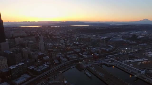 Wide aerial shot of industrial district at sunrise along the Duwamish river in Seattle
