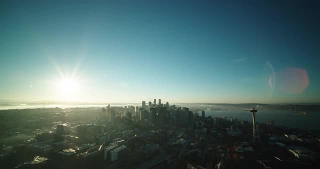 1123190 - Wide aerial shot of downtown skyline at sunrise