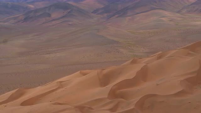 > Aerial landscape shot of the golden dry sand of the Atacama desert