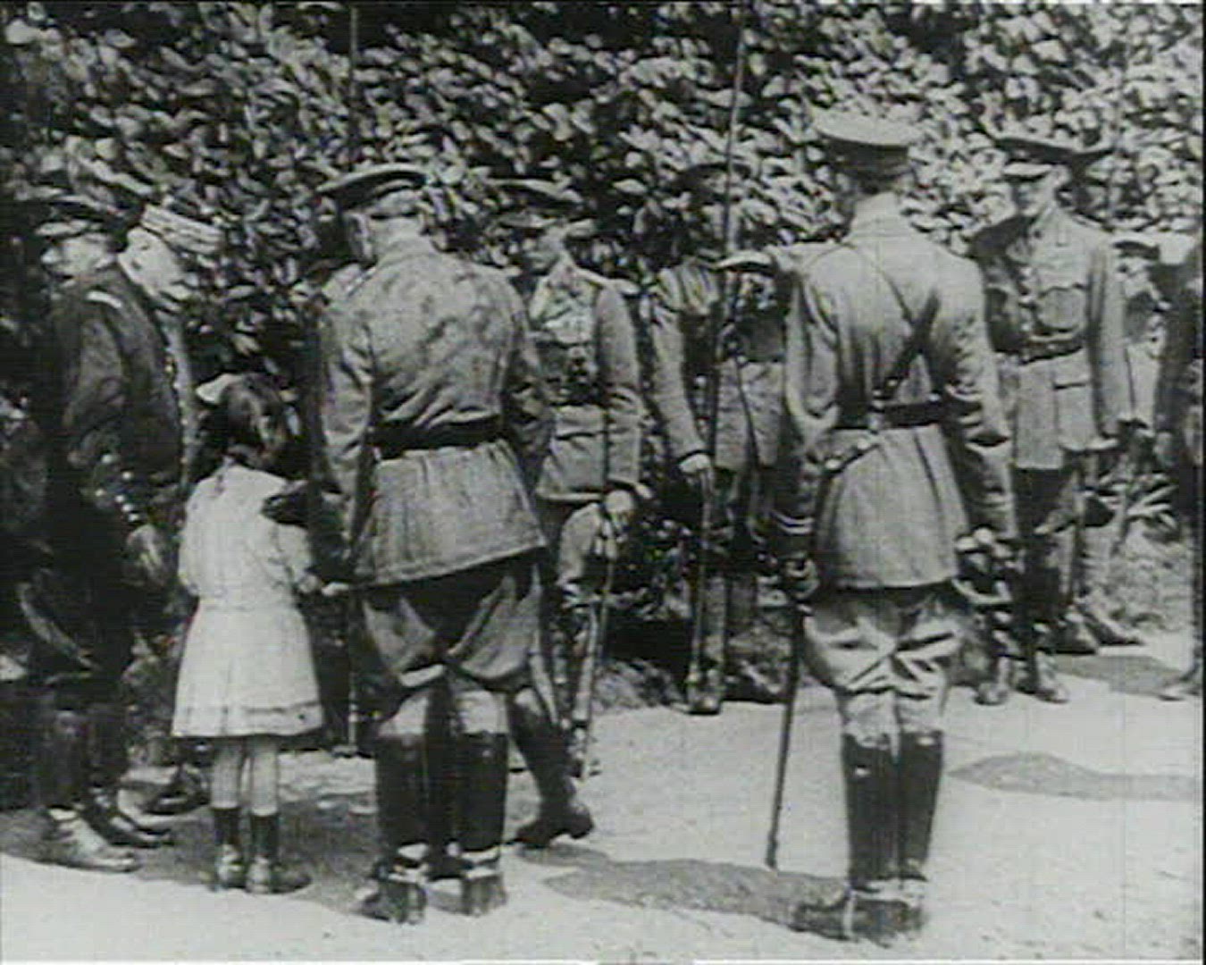 Belgium's King Albert; CU exits car, greeted by dignitaries; walks with dignitaries; soldiers parade; horse cavalrymen parade; shakes hands with France's Petain; reviews troops with Petain; confers with officer; visits trenches; talks to VIP's; CU boards fighter plane; CU adjusts helmet; plane taxis; US General John Pershing welcomes Albert, his Queen Elizabeth; Pershing, Queen on reviewing stand; US flags, US troops at attention; King, officers salute; with US Pres. Wilson; CU Wilson walks with King; in parade in NYC, large crowd; greeted on NYC City Hall steps by Mayor Hylan; CU King, Queen, mayor; Belgian Royal family at Central Park tree planting; King shovels dirt; Queen same; Prince Leopold same; CU King; at Columbia U. for honorary degree; schoolgirls wave US flags; parade in Los Angeles, lots of US flags; flower girls strew petals; on ship with Queen; CU with Queen, Prince; US cruiser, crew; CU drinks toast with diplomats; CU Queen, admiral; troop ship at sea; King, Queen saluted; people applaud; horse-drawn chariots a la 'Ben Hur'; CU King, Queen; Roman-style gladiators fight; CU Queen applauds; chariot race NICE; couple into car; King's funeral; riderless horse; EXT cathedral, crowd; soldiers march past coffin.