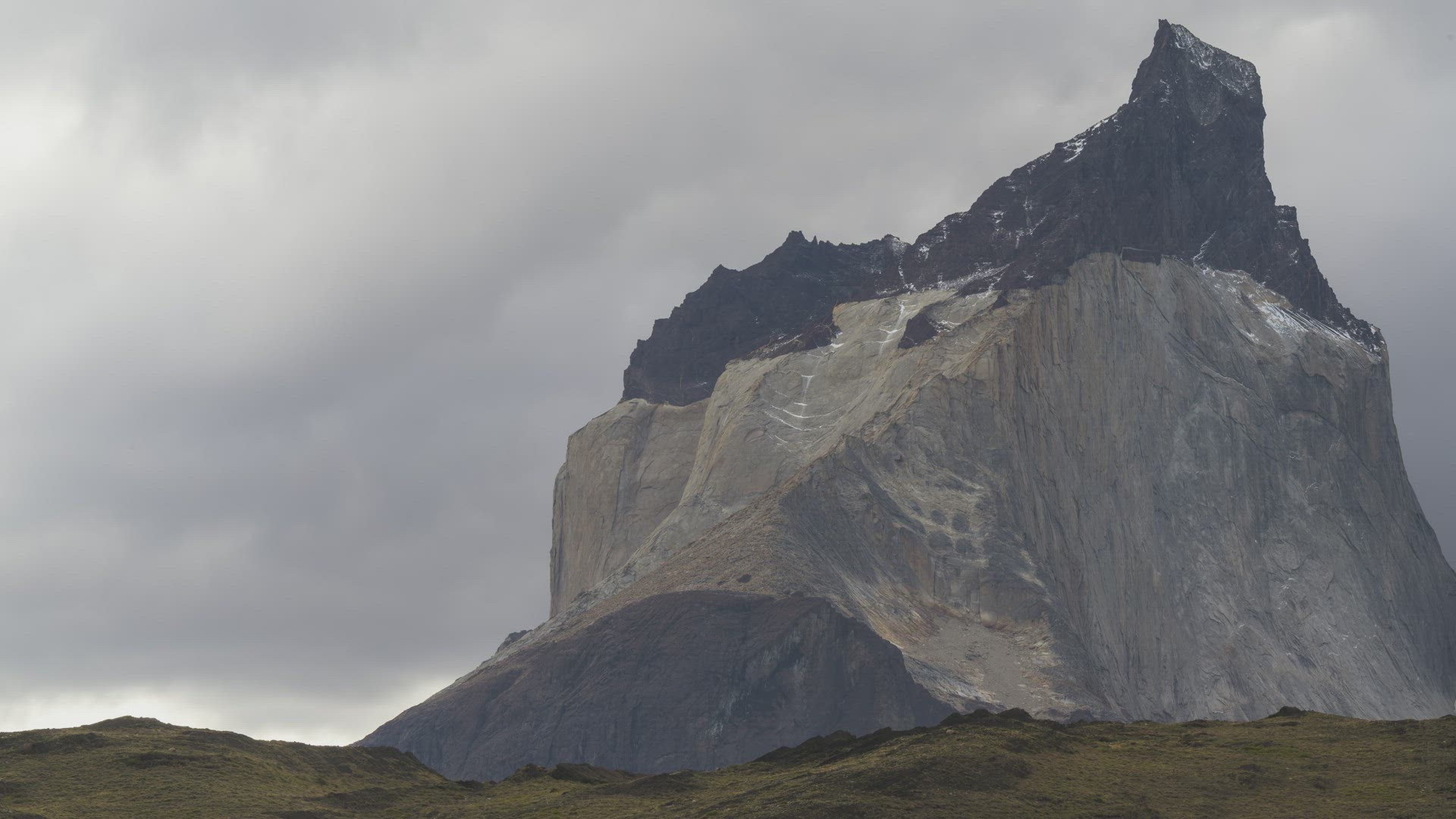 Time-lapse of snow covered Cuernos del Paine in the Torres del Paine National Park, cloudy but bright daylight.