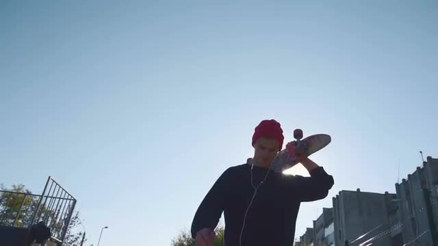 644670 - Young man walking and holding a skateboard in hand