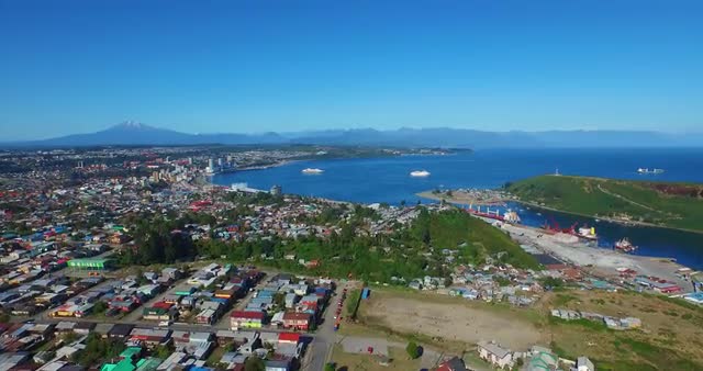 aerial view of the beach and bay of the city of Frutillar, sunny summer day