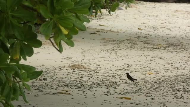 Willy wagtail bird eating a small dragonfly bug while standing on a post with a very blurred background