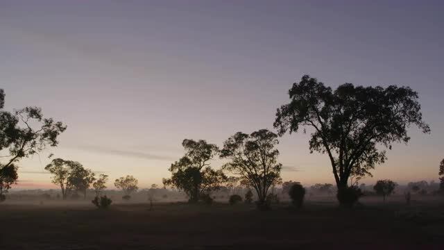 Orange sunrise through trees and haze Outback Australia