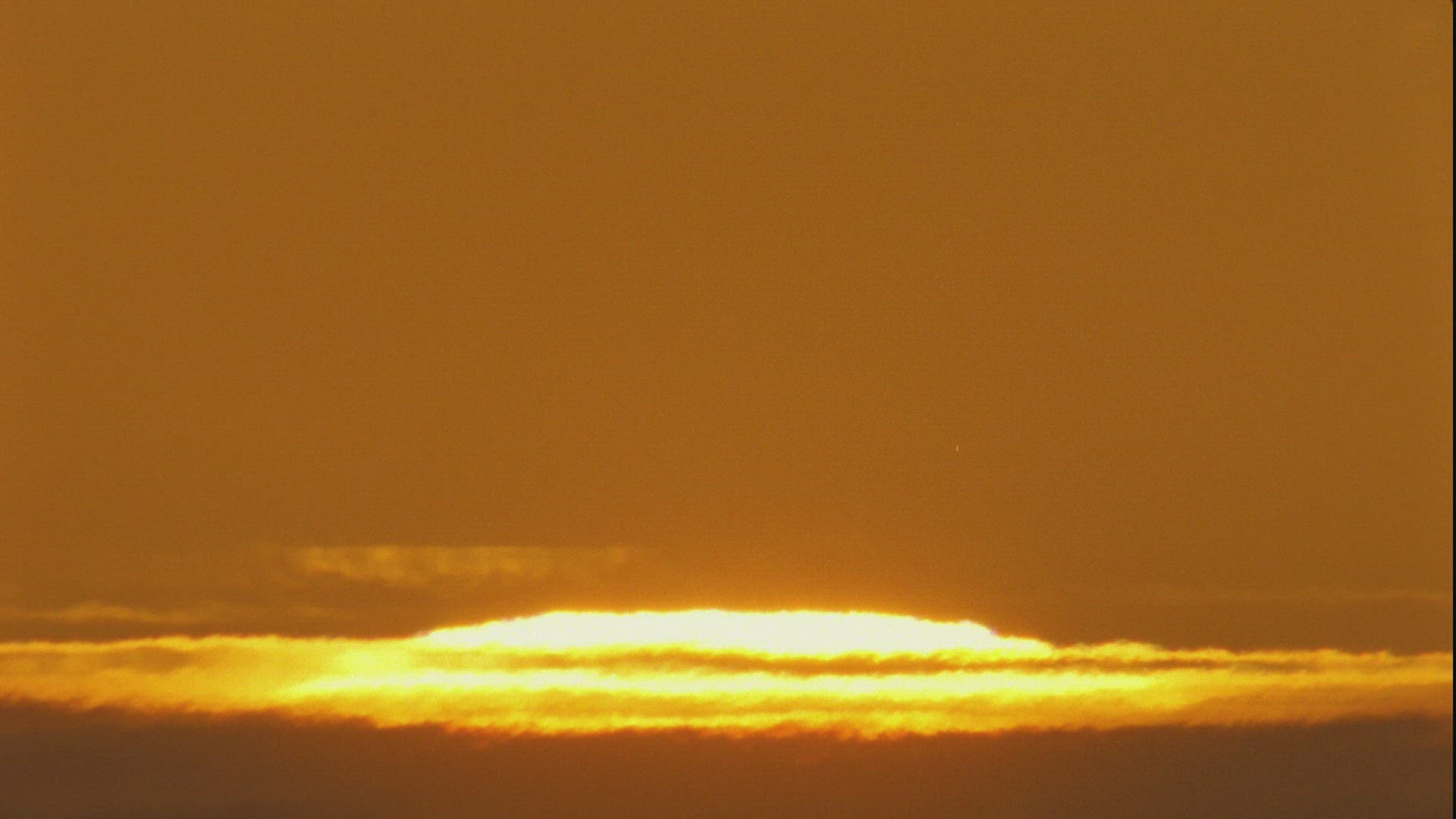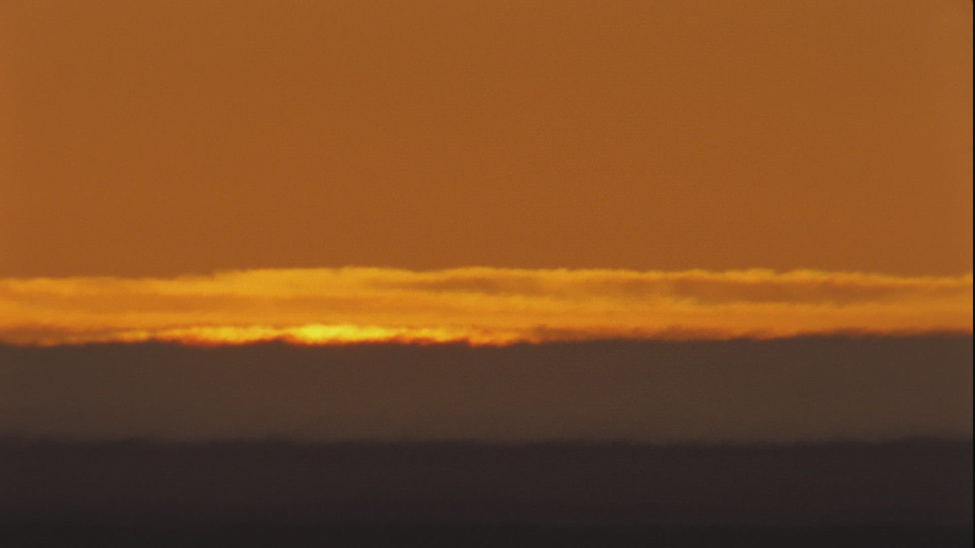 Orange sunrise through trees with a layer of fog/haze