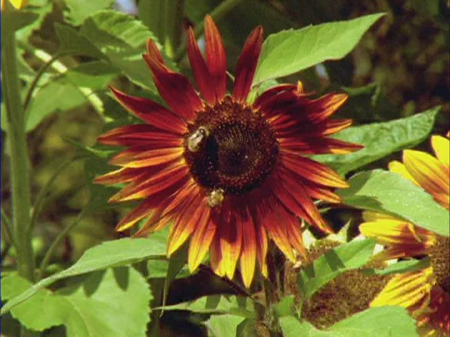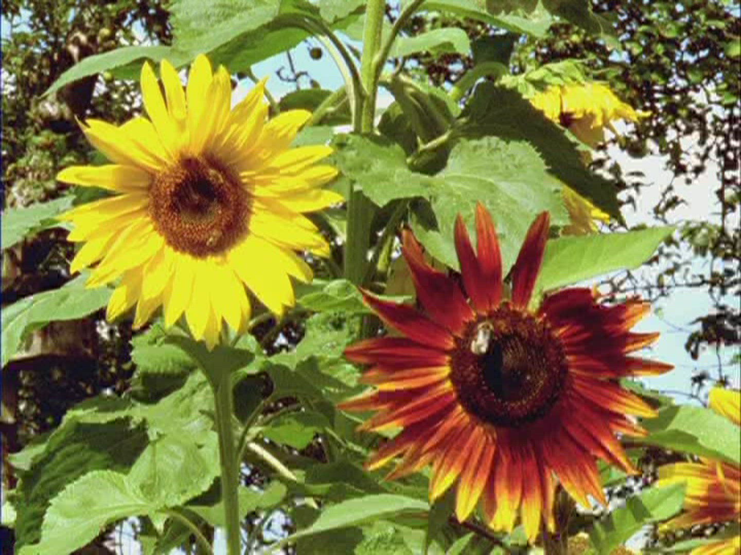 Sunflowers gently swaying in the breeze. A fly is perched on one of the flowers.
