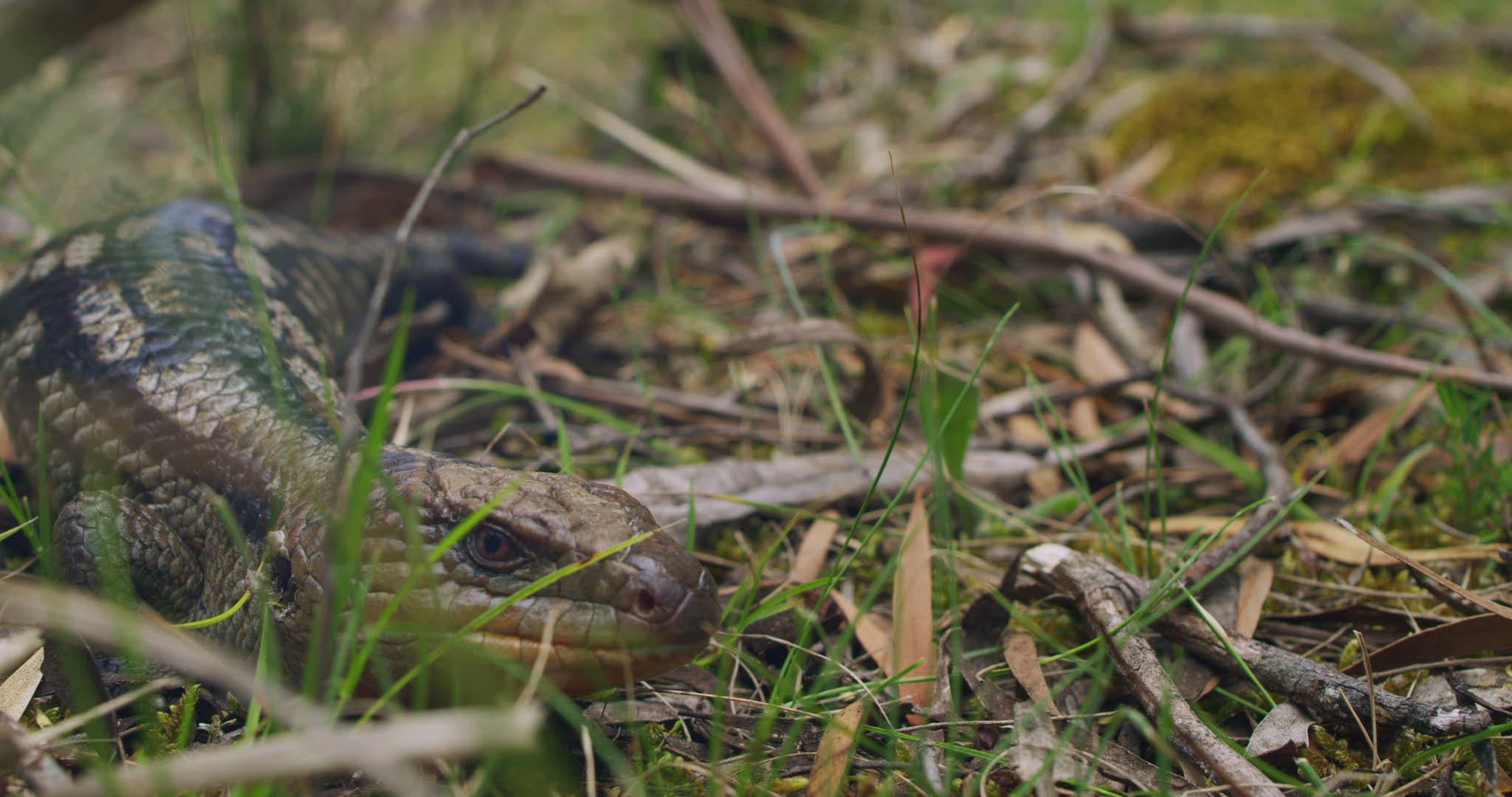 2009739 - 739990765 / Blotched Blue-Tongued Lizard / Grass / Tasmania