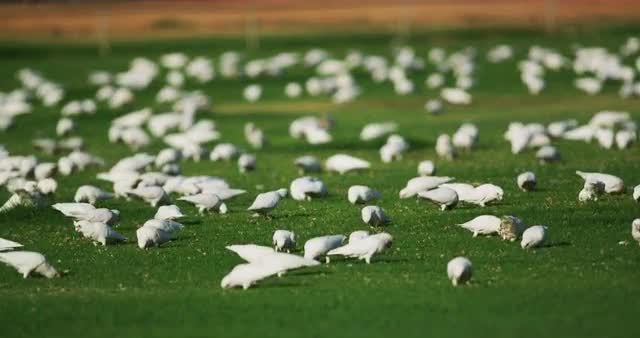 Corellas landing on grass and then eating the seeds