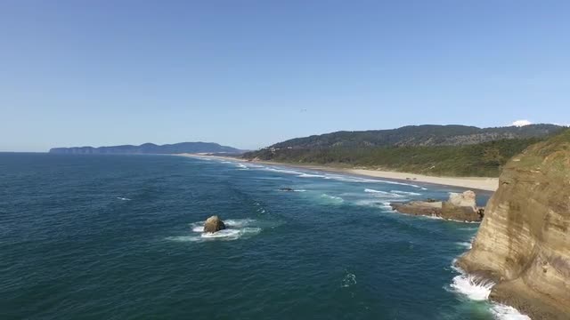Aerial footage flying over waves on the oregon coast during a colorful sunset
