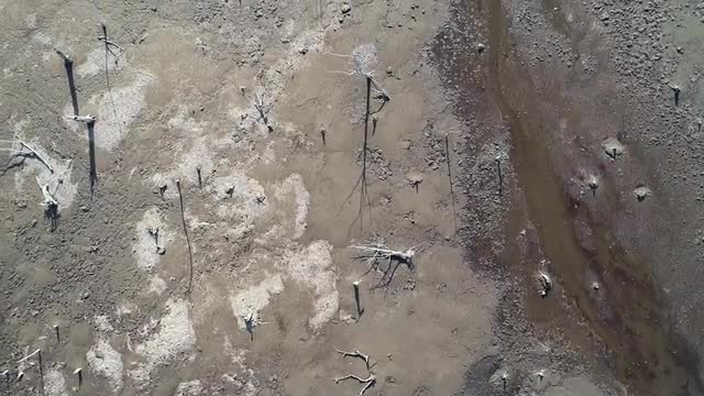 Drone takes off, capturing beautiful coastal wetlands from an aerial perspective.
