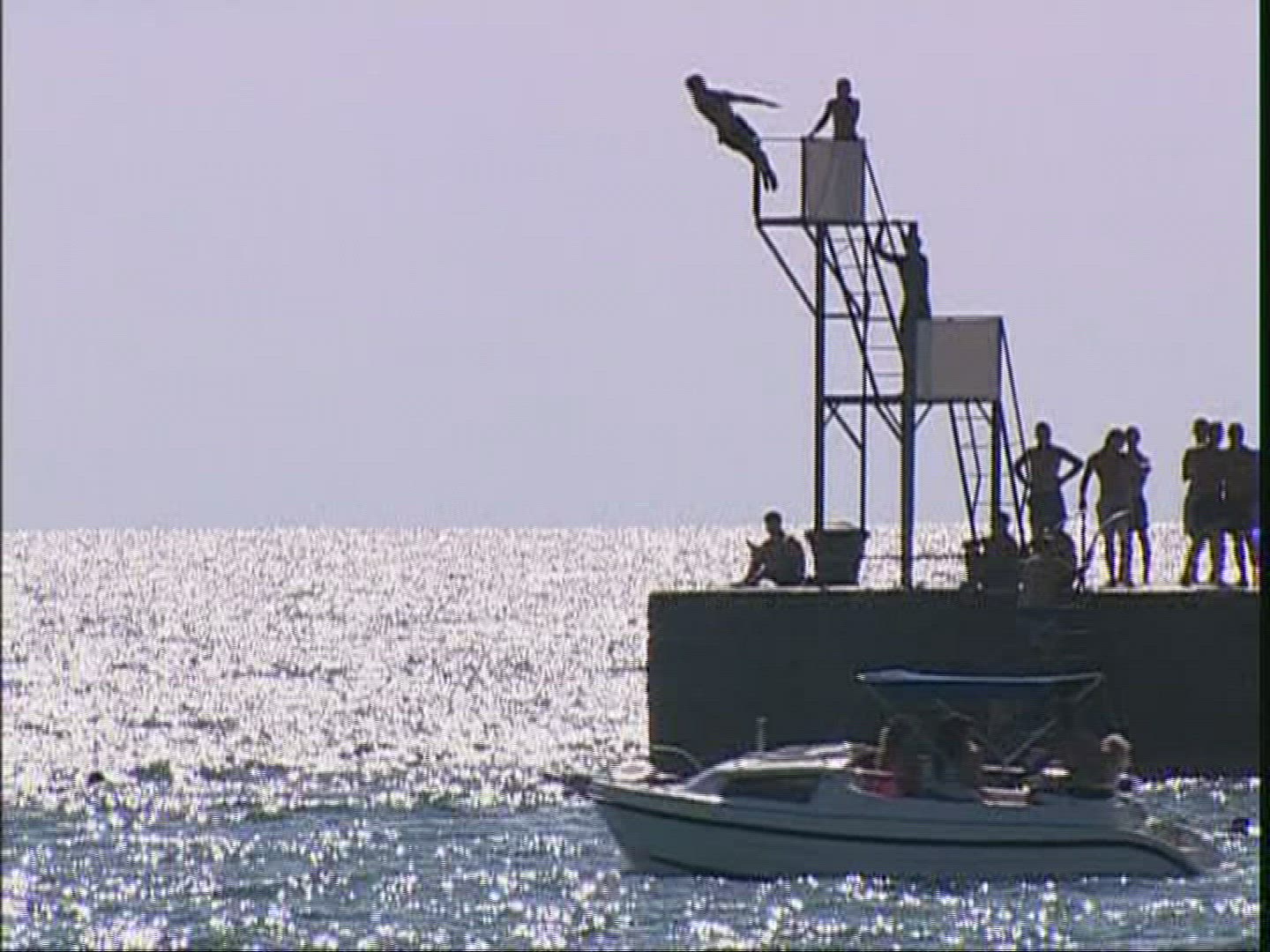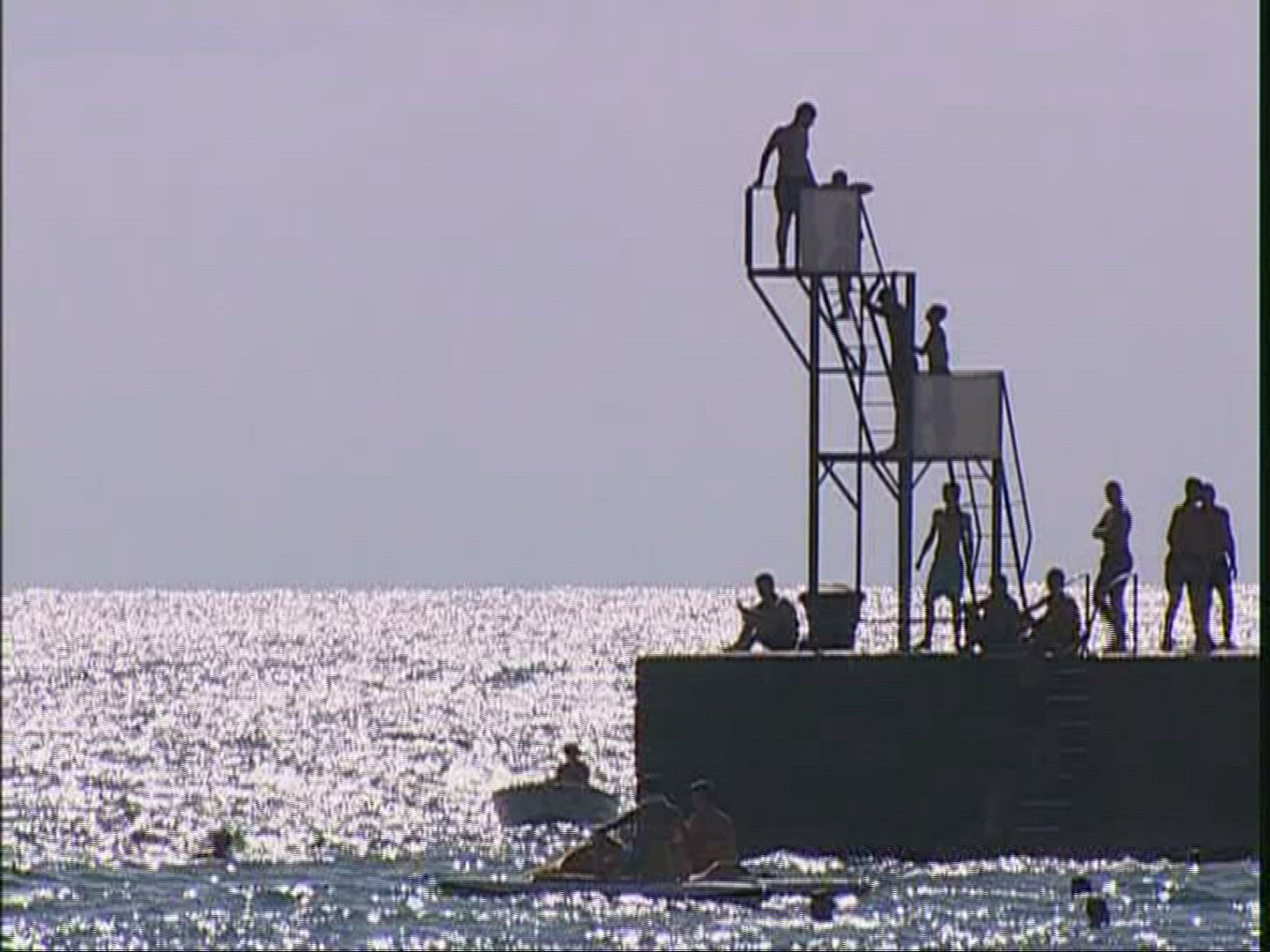 Diving platforms at ocean pool/baths slow motion dolly slider shot