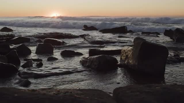 Surfer riding wave in sunrise with rocks in the foreground