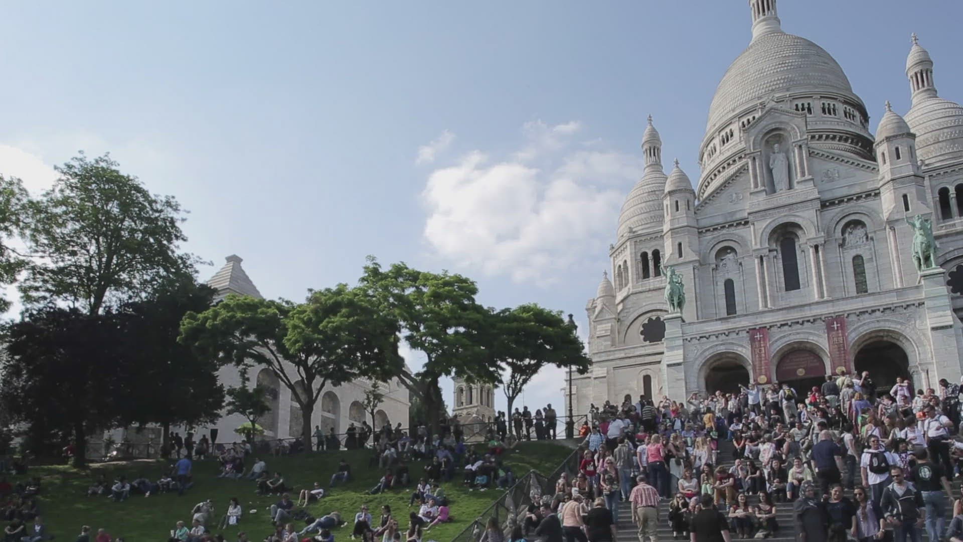 Aerial Hyperlapse over Paris Streets with Sacre Coeur on the Horizon at Sunset