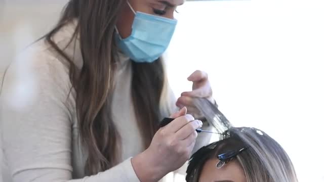 > Reflection of hairdresser working on clients hair in the mirror