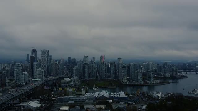 > Opening shot of the bridge and Vancouver downtown on evening