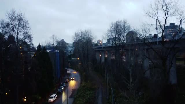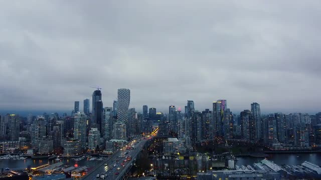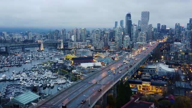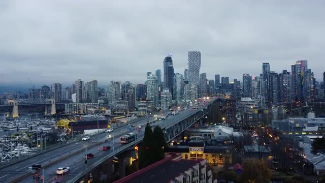 Opening shot of the bridge and Vancouver downtown on evening
