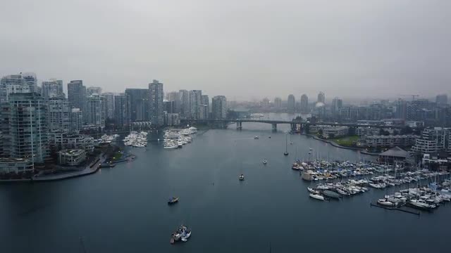 > Aerial view of creek in Vancouver with the bridge and sailing ships