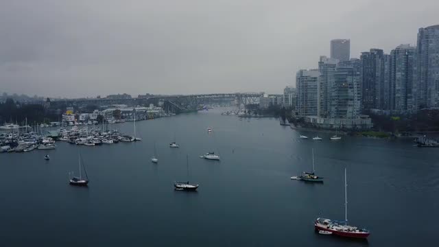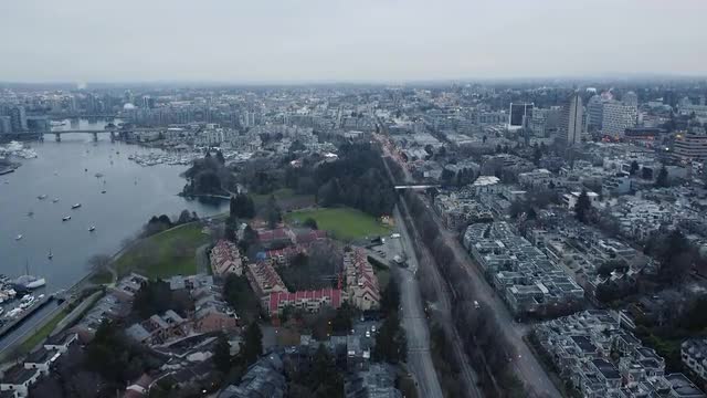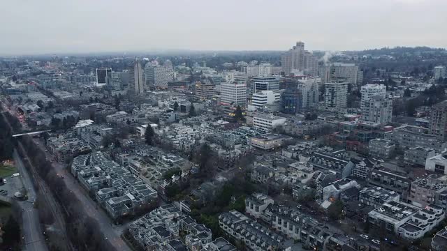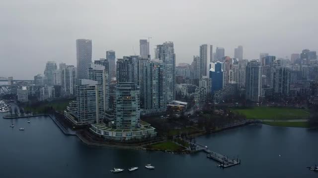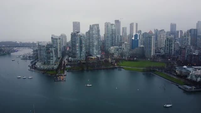Aerial view of buildings in Vancouver downtown on an overcast rainy day