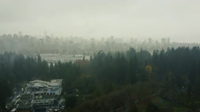 Opening aerial shot of Vancouver downtown and yachts on a rainy day