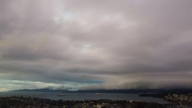 Fly over Burrard inley with cargo ships waiting on a cloudy evening in Vancouver
