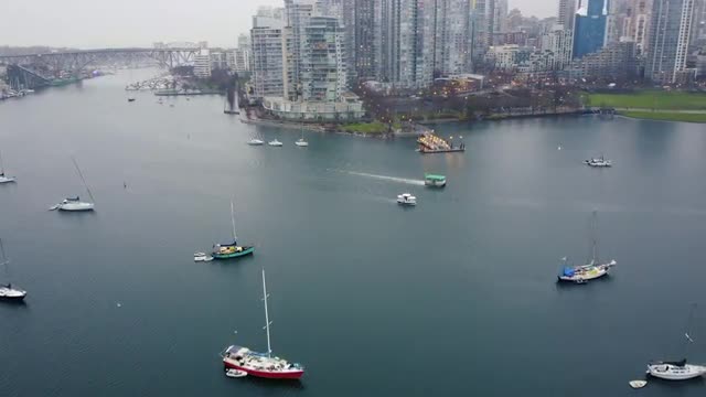 Fly away from Vancouver downtown, bridges and Granville island in the morning