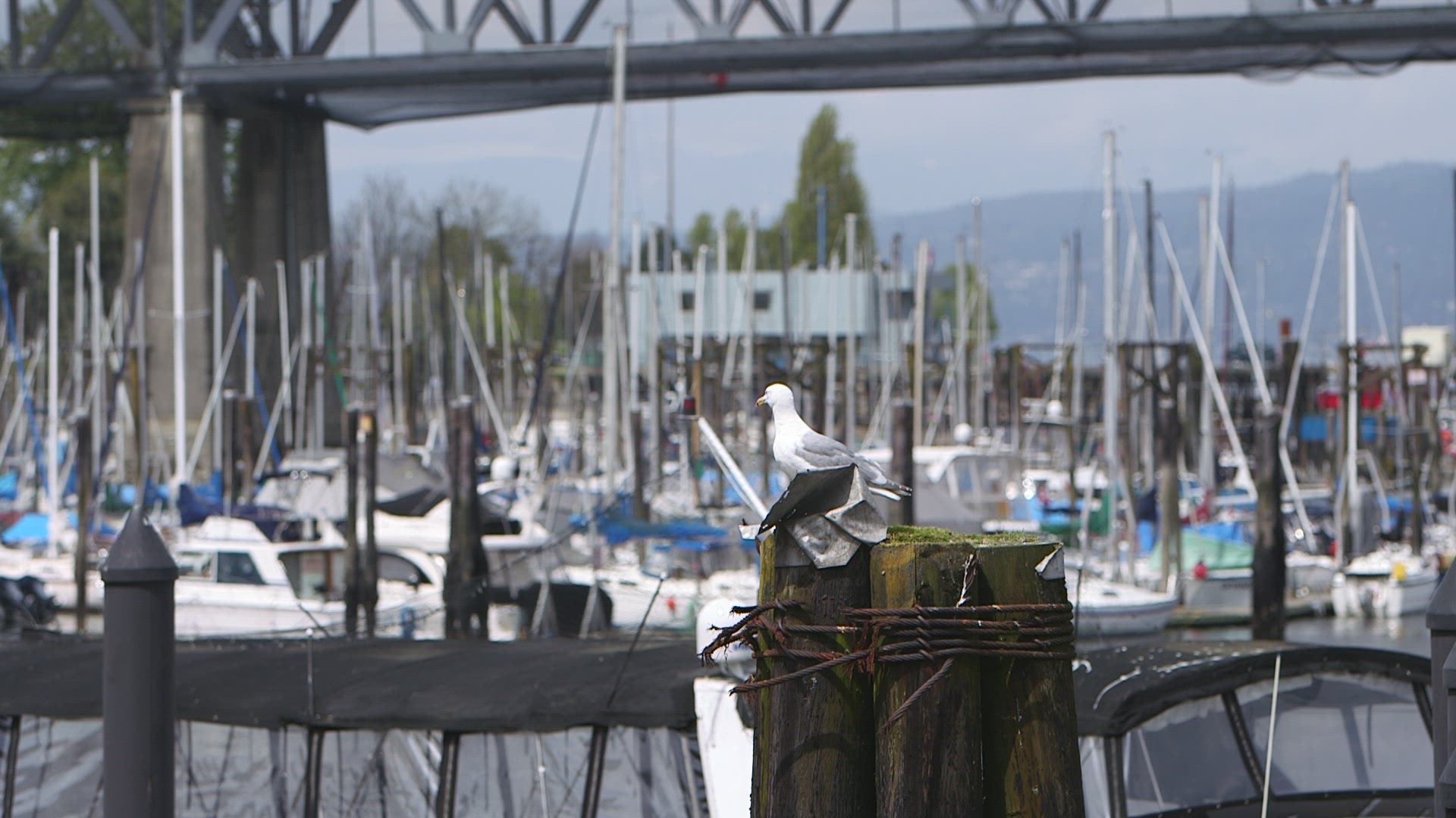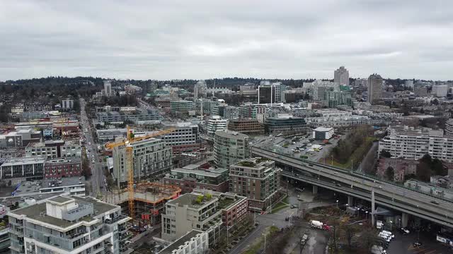 > Fly away from Vancouver downtown, bridges and Granville island in the morning