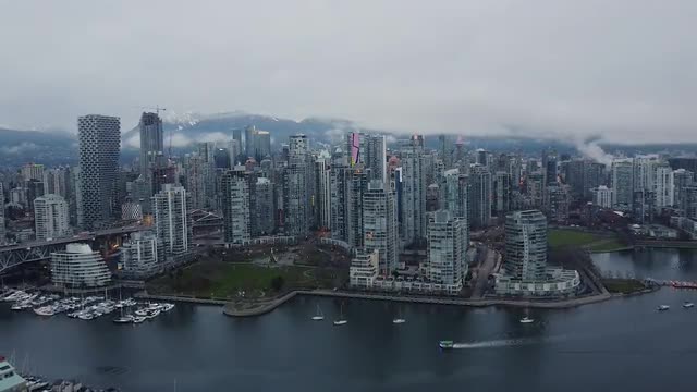 Zoom out from Vancouver downtown and mountains covered with low clouds on back