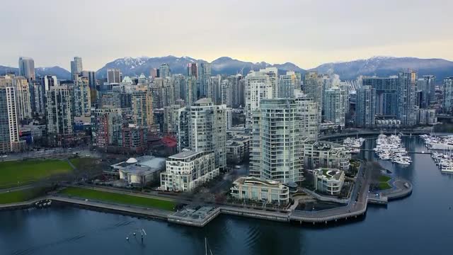 Aerial view of runway and Vancouver downtown in the morning