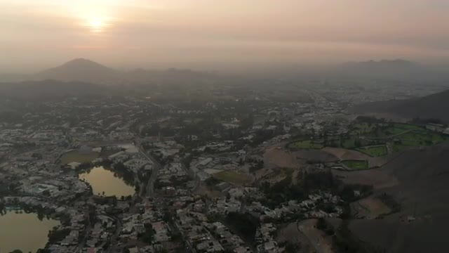 Aerial sunset over La Molina district of Lima, Peru showing the la laguna lagoon and the beautiful golden light of sunset.