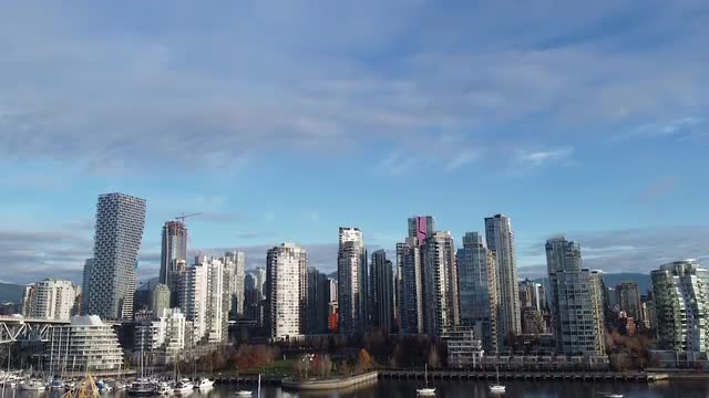 Aerial view of downtown Vancouver and beach in English bay on a sunny evening