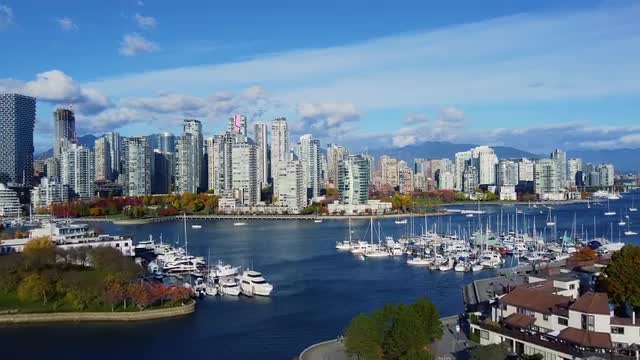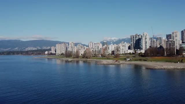 > Aerial view of English bay in Vnacouver with snowy mountains on background