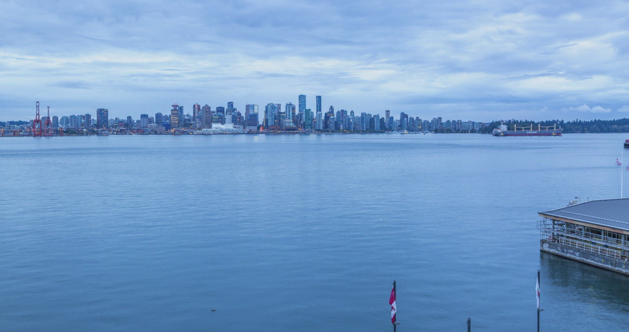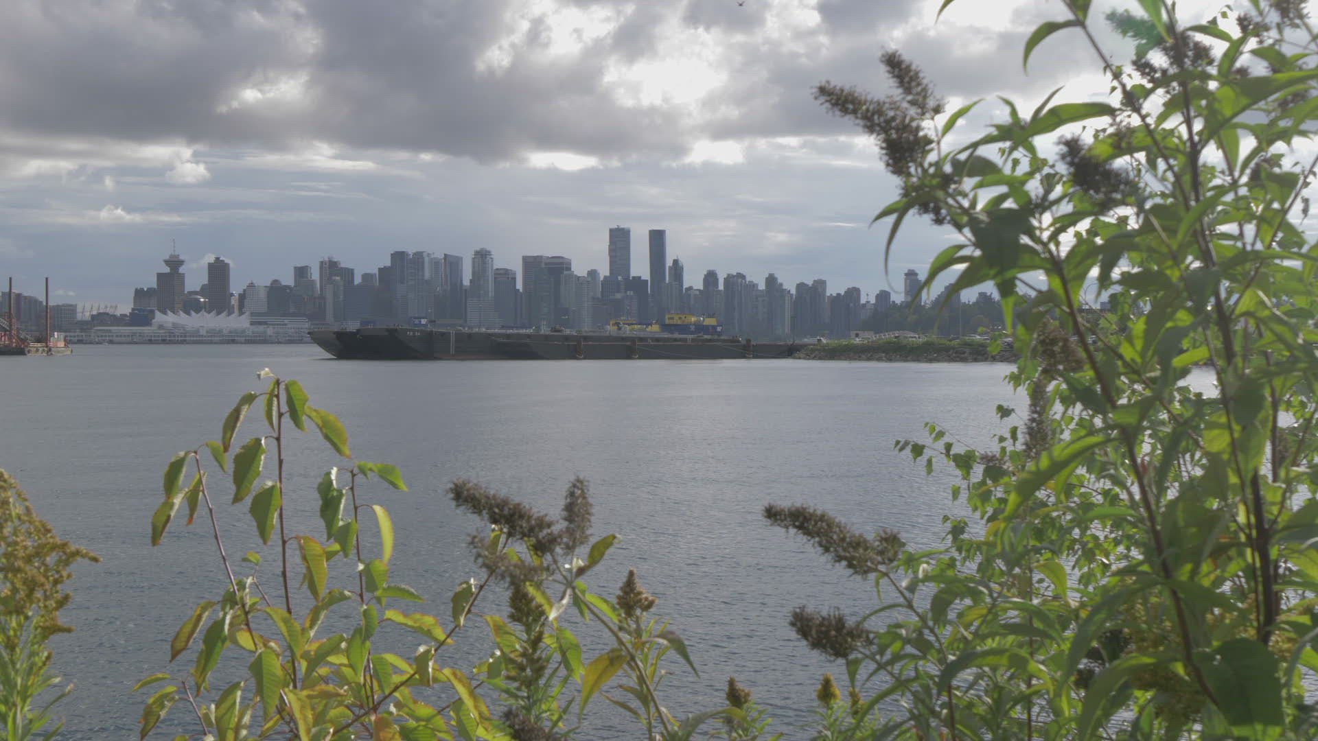 > Aerial view of Vancouver downtown on a rainy day an yachts moored