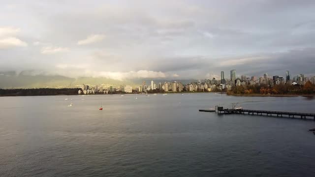 Aerial view of Vancouver downtown, small yachts on a sunny evening