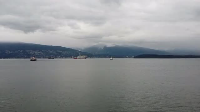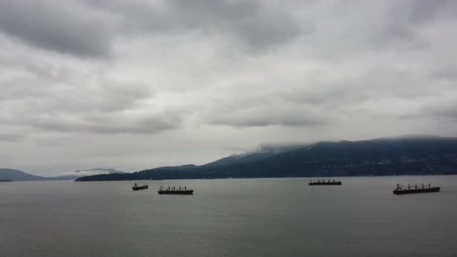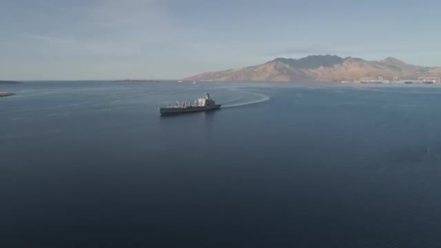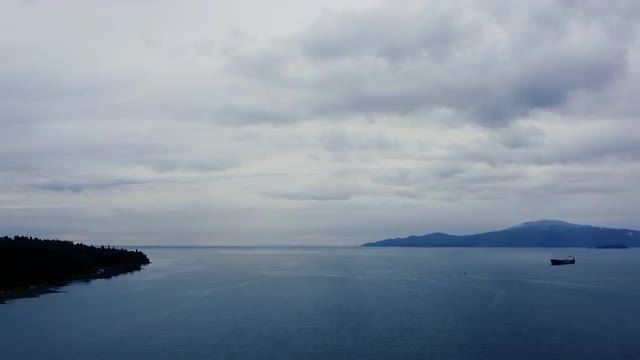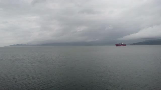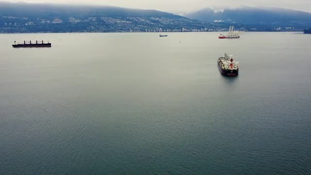 Lonely green cargo ship in the bay near Vancouver