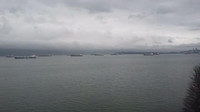 > Lonely green cargo ship in the bay near Vancouver