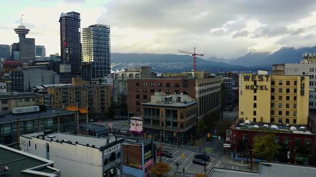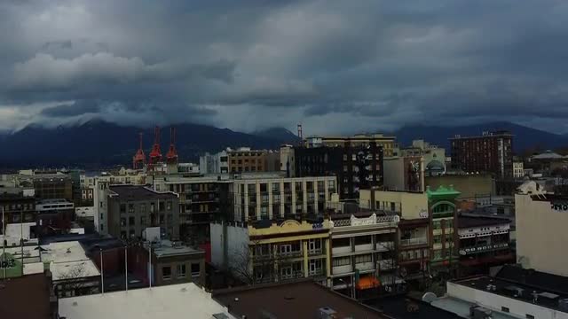 > Aerial view of cloudy Vancouver evening in Olympic village