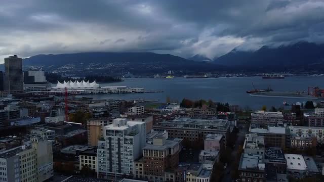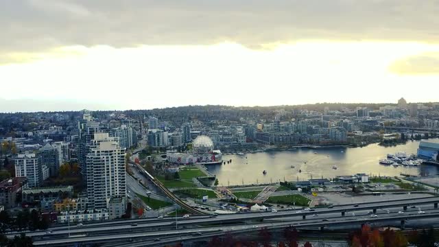 Fly over autumn street in Vancouver with two buses