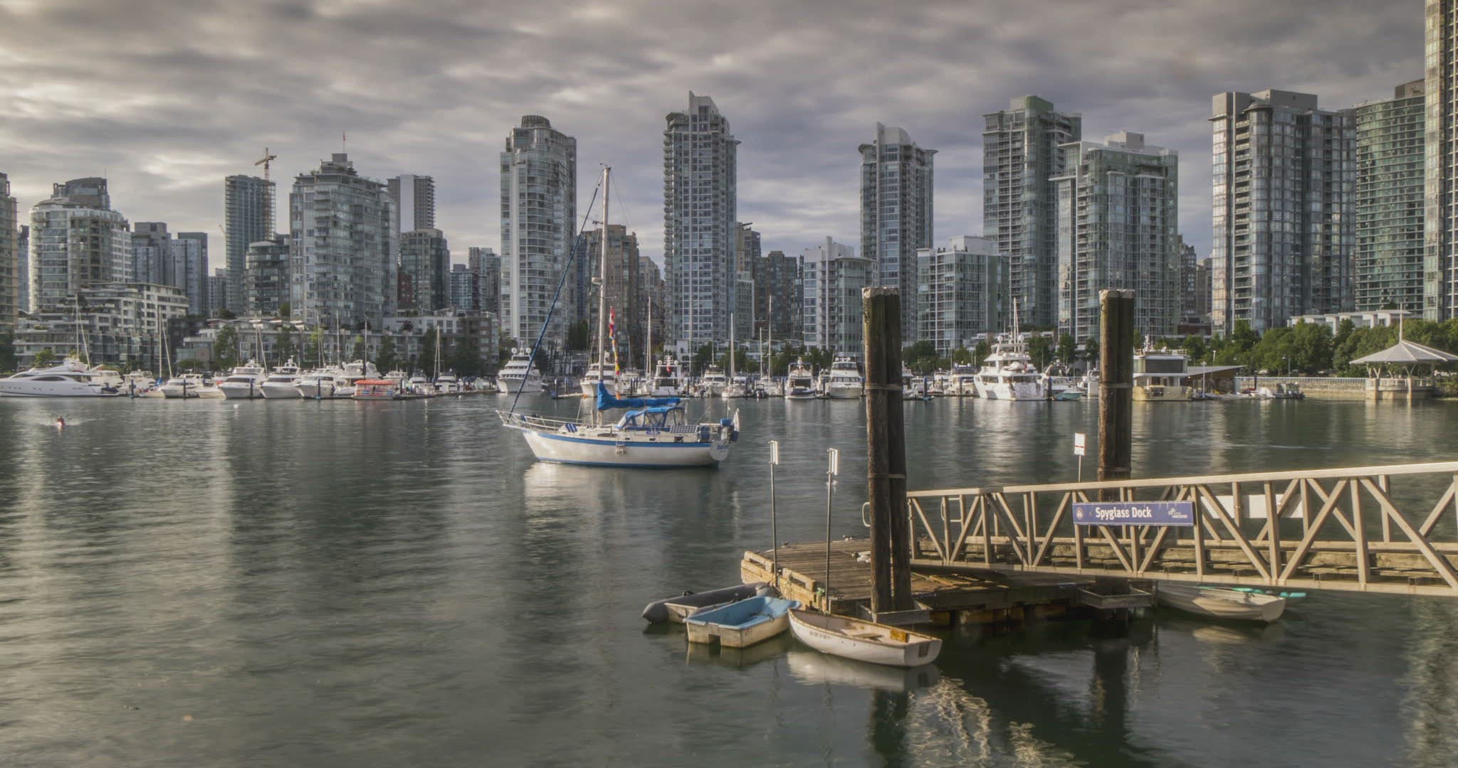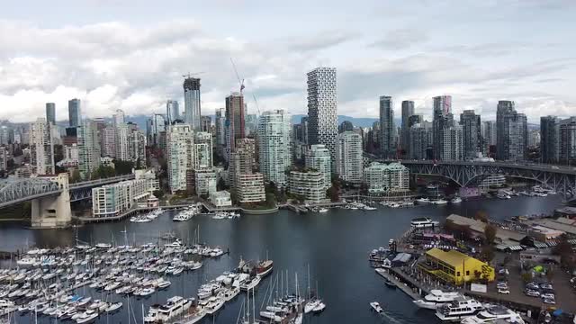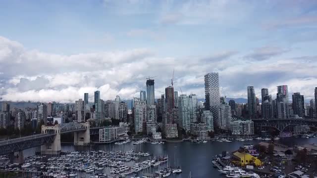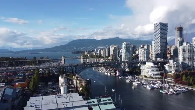 > Fly over autumn street in Vancouver with two buses