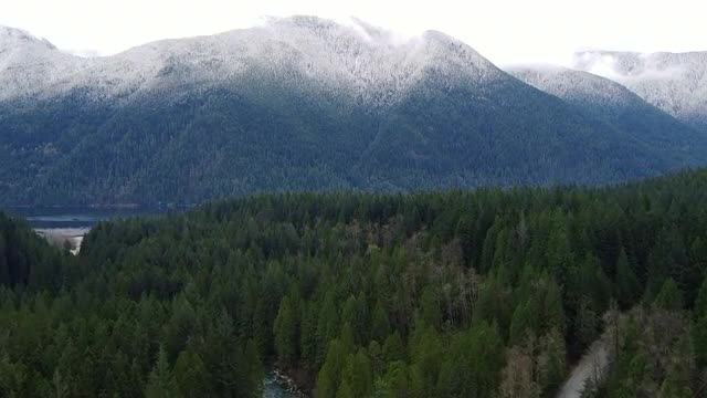 > Fly over green spruce forest with snowy mountains ahead
