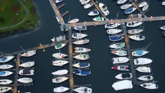 Top down view of small boats in marina on a nice evening in Vancouver