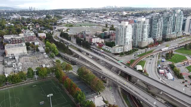 Drone shot of Vancouver skytrain, football field and highway on the bridge