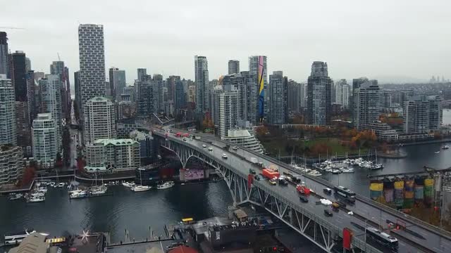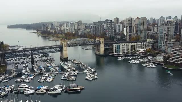 > Aerial view of marina and yachts moored in Vancouver bay