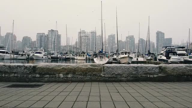 > Vancouver boardwalk with the yachts and downtown. A couple passing by