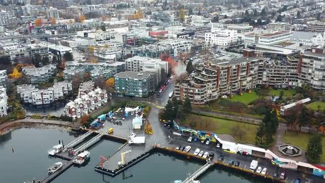 > Aerial view of yachts anchored in the foggy and infinite ocean
