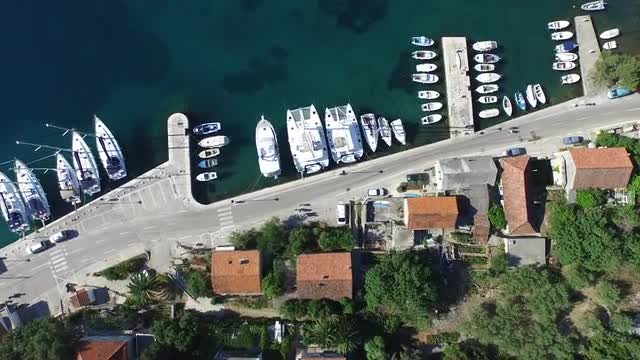 Aerial view of yachts anchored in the foggy and infinite ocean
